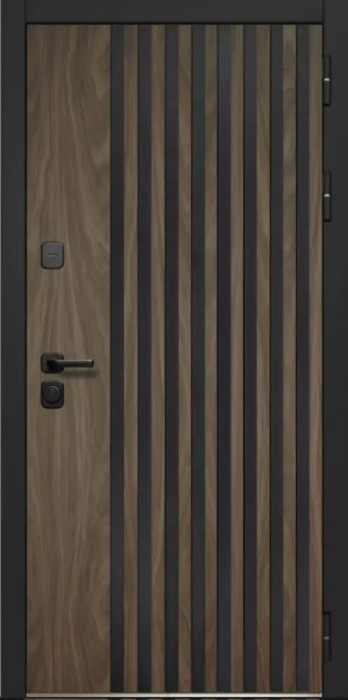 Металл: Порошково-полимерное покрытие, цвет Муар черный Отделка снаружи: лист стали + ламинированная МДФ панель 12мм , цвет Орех Американский мокко, вставка+ наличник Антрацит софт